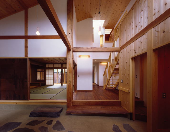 | 里山の民家〜古材再生〜 欅普請の生家の柱、梁、床板などを再生利用した住宅です 蔵、池のある庭、思い出のある樹木との調和を意識しています。 瓦屋根は家並みをつくり、庭や樹木は新たになった建物に奥行きの深さを与えます 新しくなった建物も存在感たっぷりに今までそこにあったように、 そんなイメージをもちながら設計しました 景観と光・風など環境、古材と新たな素材、住み手とつくり手の調和と融合がテーマです |