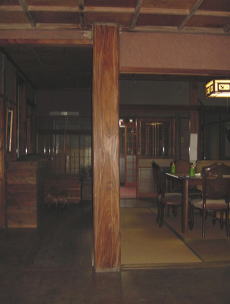 古材利用の座敷 床柱や欅の古材を利用、力強い古材に負けぬ材料で、引き締まった空間を演出しました。書院窓も再生利用です |